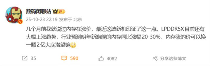 同时,数码博主“数码闲聊站”也指出,内存的价格涨幅比想象中更大,并且这一波涨价已经开始影响新机的定价。他预测,随着LPDDR5X内存的持续上涨,明年旗舰机型的内存涨幅可能达到20-30%,而这种价格上涨相当于可以购买一颗2亿大底的潜望镜头。
